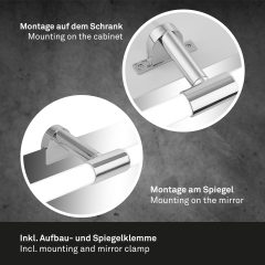 Inovativni sestav 2 v 1, ta lučka za omarico ponuja vrhunec kopalniške osvetlitve: lahko jo priključite neposredno na ogledalo ali privijete na omarico za ogledalo.