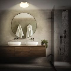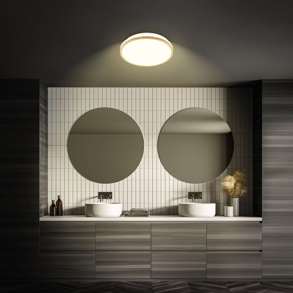 LED stropna svetilka za kopalnico v beli in leseni barvi, ta elegantna kopalniška svetilka združuje sodoben dizajn s toplimi lesenimi poudarki. Opremljena z 12W LED ploščo (1200 lm, 3000 K) zagotavlja prijetno, toplo osvetlitev in se odlično poda v elegantne kopalnice.