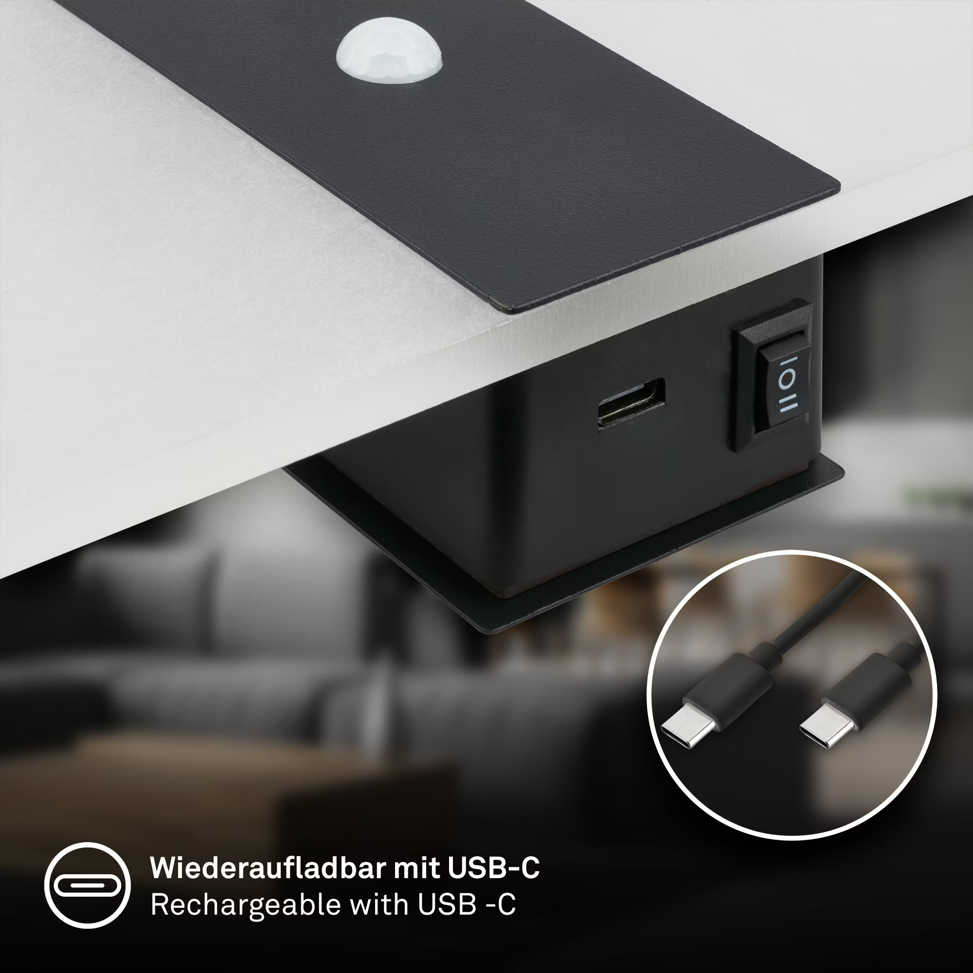 - Zmogljiva polnilna baterija, baterija z zmogljivostjo 1800 mAh ponuja do 400 ciklov vklopa v načinu senzorja, je enostavno zamenljiva in jo je mogoče priročno napolniti s priloženim 0,5 m kablom USB-C.