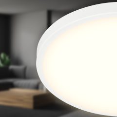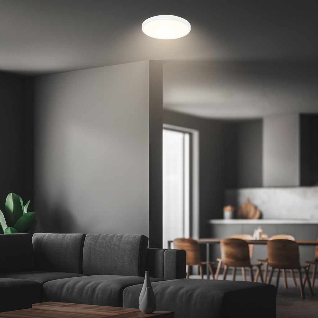 Elegantna LED stropna svetilka z dekorativno ploščo, ta elegantna svetilka za dnevno sobo v beli barvi združuje sodoben dizajn z 12W LED ploščo (1300 lm, 3000 K), ki oddaja toplo belo svetlobo in ustvarja prijetno in vabljivo vzdušje.