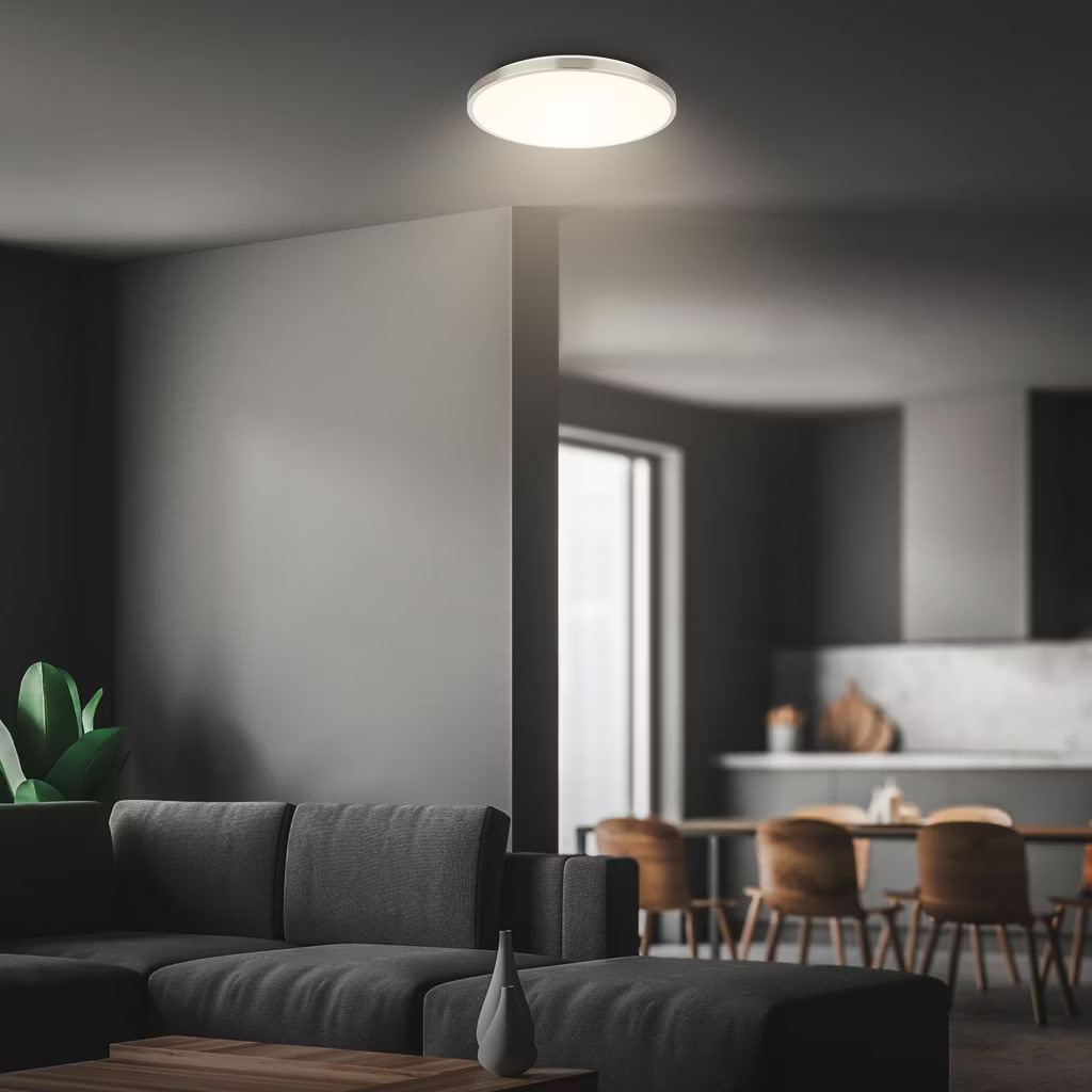 Elegantna LED stropna svetilka z dekorativno ploščo, ta elegantna svetilka za dnevno sobo v mat nikljevi barvi združuje sodoben dizajn z 22W LED ploščo (2400 lm, 3000 K), ki oddaja toplo belo svetlobo in ustvarja prijetno in vabljivo vzdušje.