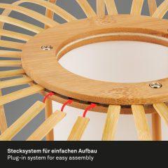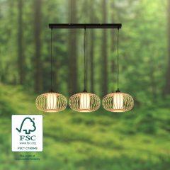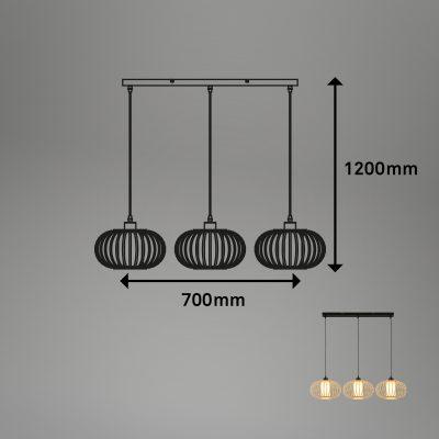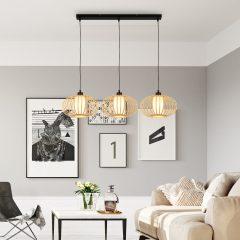- S svojimi dimenzijami se ta stropna svetilka harmonično prilega vašim prostorom. Zaradi skupne višine 1200 mm in dolžine 700 mm, z 280 mm senčniki iz bambusa, je idealna izbira za vašo kuhinjo, kjer lahko deluje kot kuhinjska svetilka. Vnesite toplino in stil v svojo notranjost s to svetilko za dnevno sobo v retro slogu in naj vaše sobe zasijejo v novi luči.