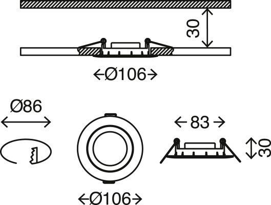 - Povprečna življenjska doba je zelo dolga, okoli 25.000 ur, tako da boste v vgradnih svetilkah lahko uživali še dolgo. Dimenzije izdelka: 106x30mm, vgradne mere: 86x30mm.