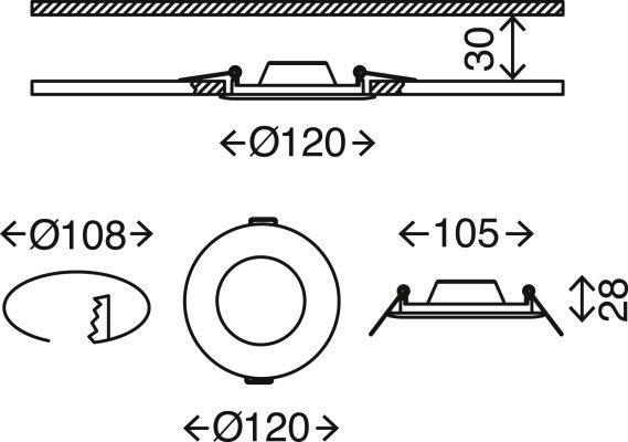 - Povprečna življenjska doba je zelo dolga, okoli 25.000 ur, tako da boste v vgradnih svetilkah lahko uživali še dolgo. Dimenzije izdelka: 120×28 mm; Vgradna mera: Ø108mm, vgradna višina: 30mm