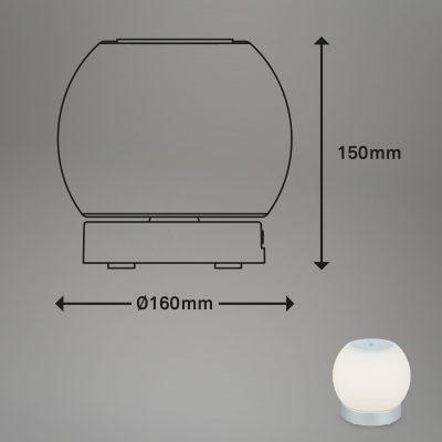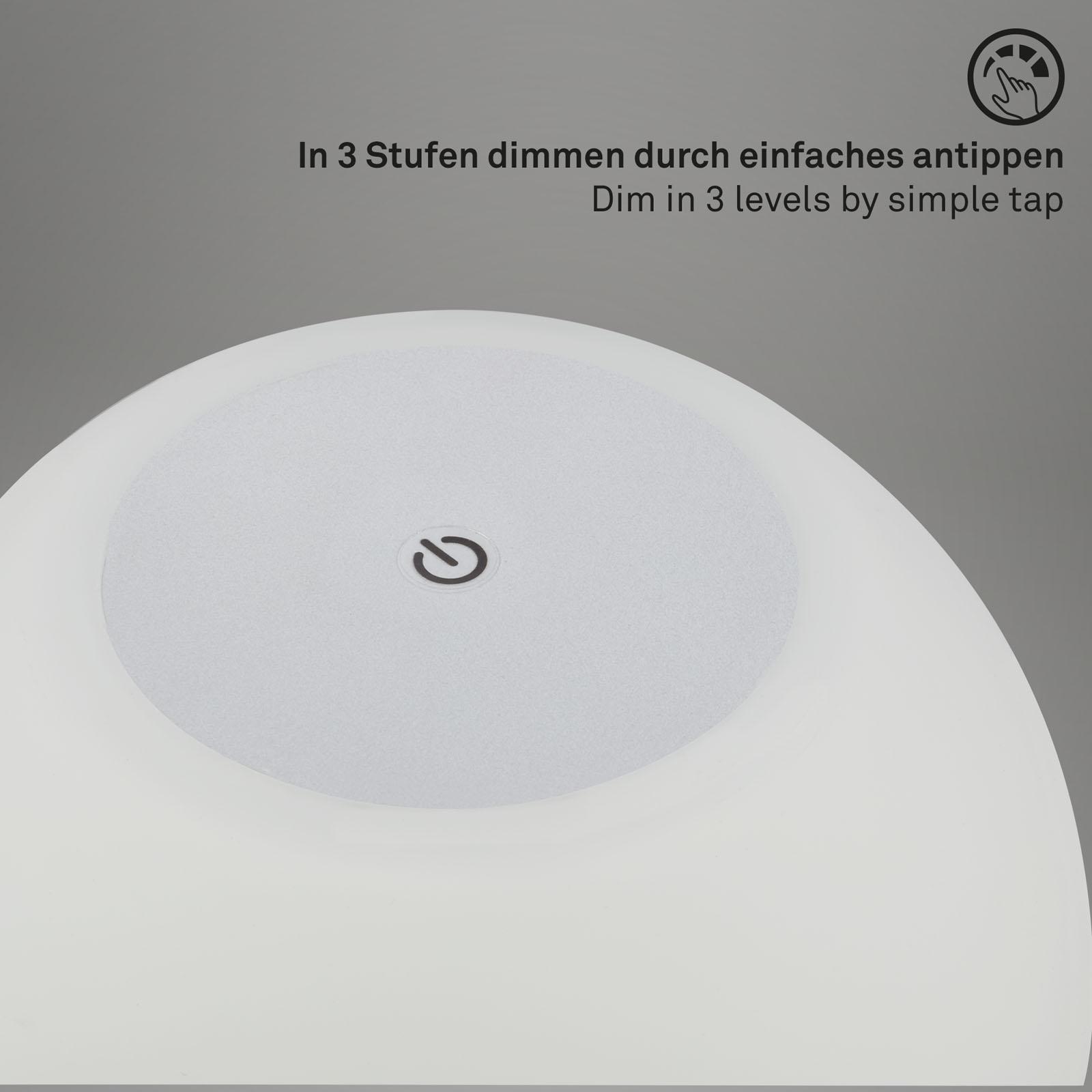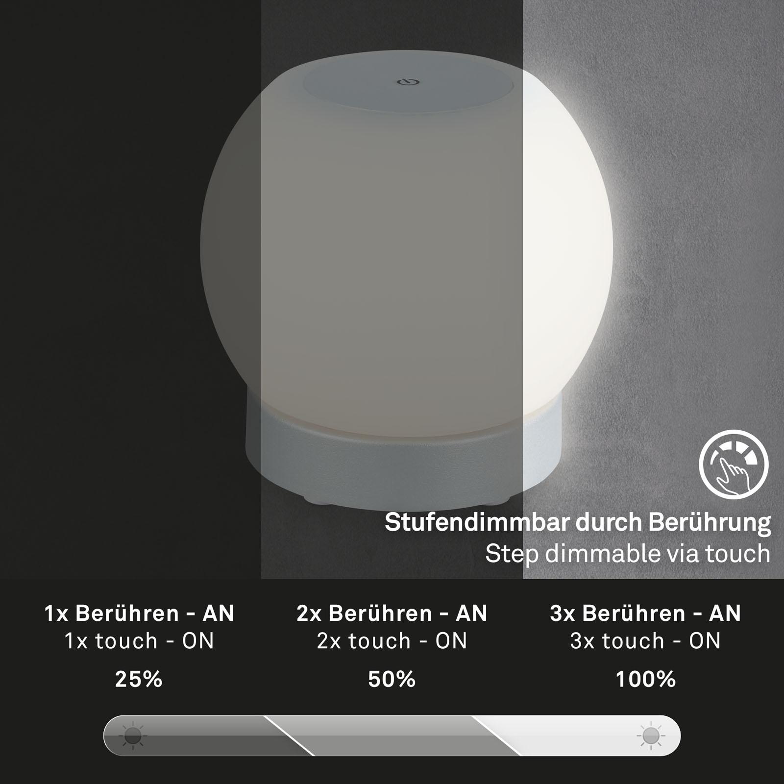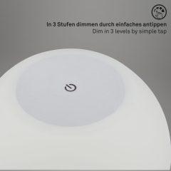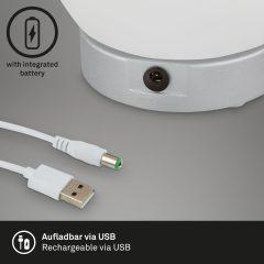 - LED baterijska namizna svetilka v mat kromu ima toplo belo barvno temperaturo 3300 Kelvinov. Posebej izpostavljamo funkcijo na dotik, ki omogoča 3x postopno zatemnitev svetlosti, kot tudi vgrajeno baterijo. Vgrajena baterija ima čas delovanja do 5 ur, ko je popolnoma napolnjena. Okrasno lučko lahko napolnite s priloženim 2 metra dolgim USB kablom.