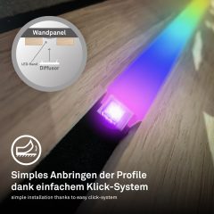 Individualne dimenzije, z dimenzijami 1300x20x10 mm se ta difuzor natančno prilega LED-trakom Pimp your Panel in zagotavlja brezhibno integracijo v vašo obstoječo stensko ploščo z razmiki 14-15 mm.